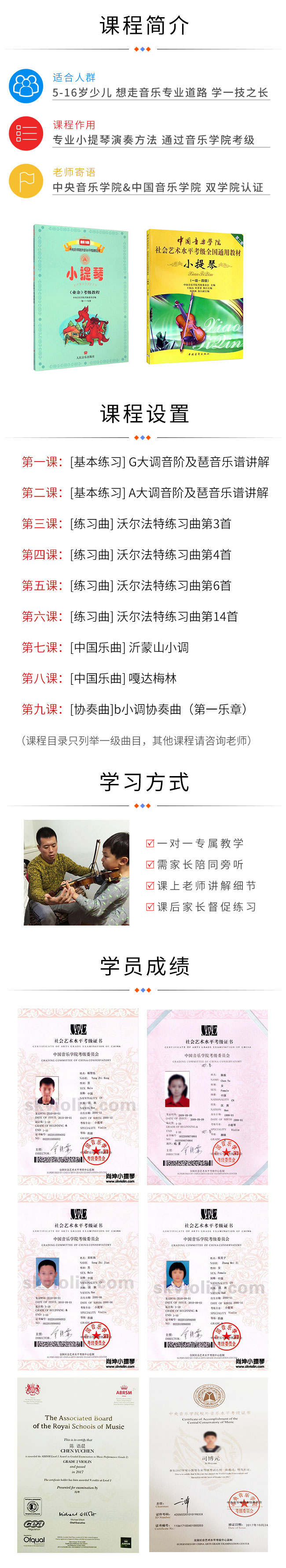 针对考级需求,我们会根据孩子们的年龄和音乐水平设计专业的小提琴教学大纲,通过分级教学的方式循序渐进地教授小提琴的基本功和技巧。帮助孩子们熟练掌握考级曲目和技巧要点,保证他们顺利通过小提琴考级,获得相应的证书和奖项。